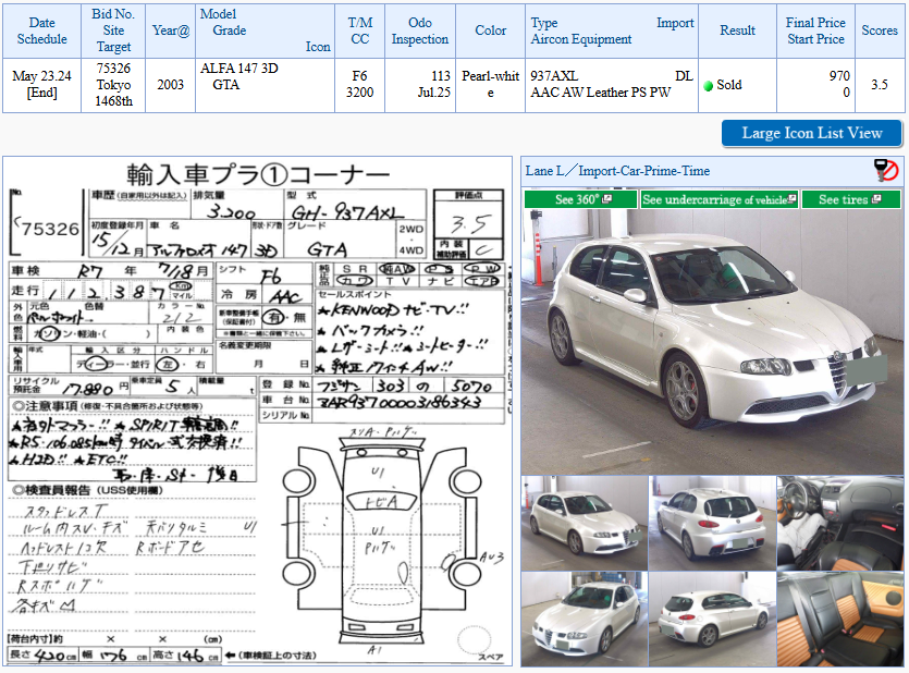 Guigui Posted 2024-05-22 - 05:52:02 #1 Posted 2024-05-22 - 05:52:02 Enchère USS Tokyo No.75326 Date -- Type de véhicule ALFA 147 3D GTA Année 2003 Kilométrage 113,000 Type de boite -- Cylindrée -- Grade 3.5 Transmission F6 Date inspection Jul.25 Extra photos Non Prix de départ 0¥ Prix final 0¥ Statut À venir